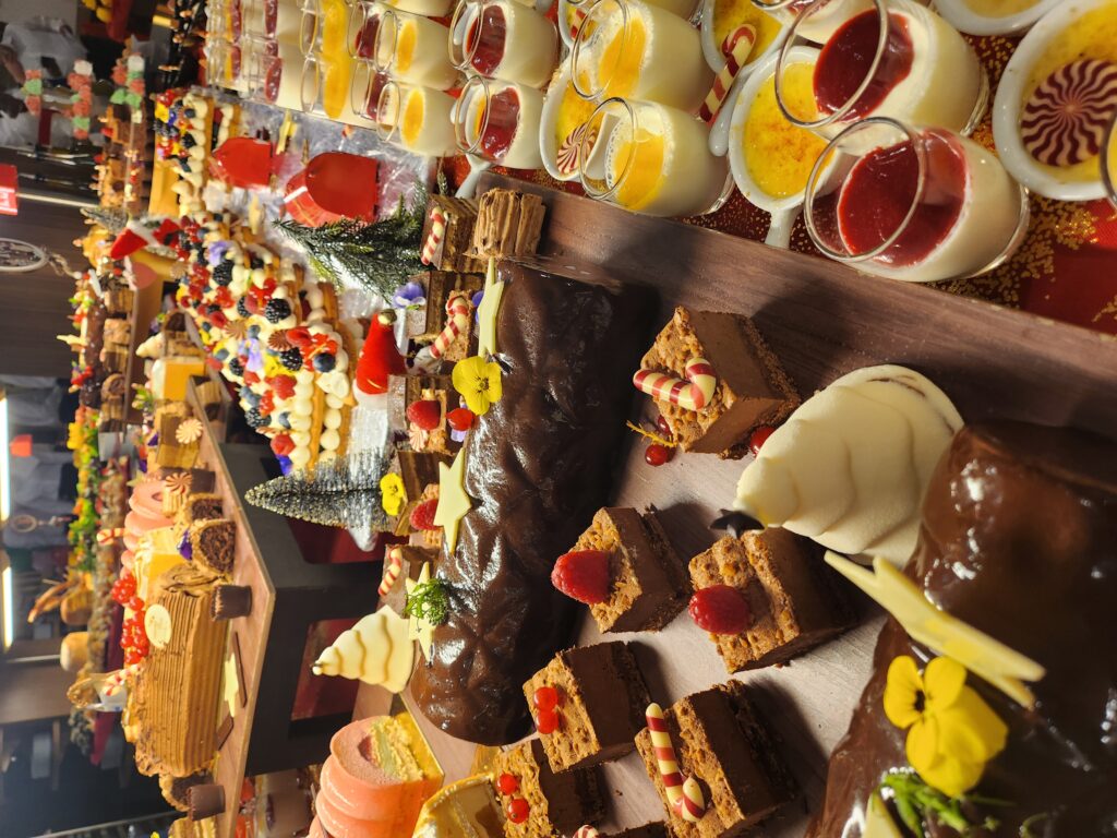 dorade snacké. Un buffet dédié attend les jeunes moussaillons, avant une avalanche de desserts incluant bûches et pâtisseries de Noël, et friandises variées.